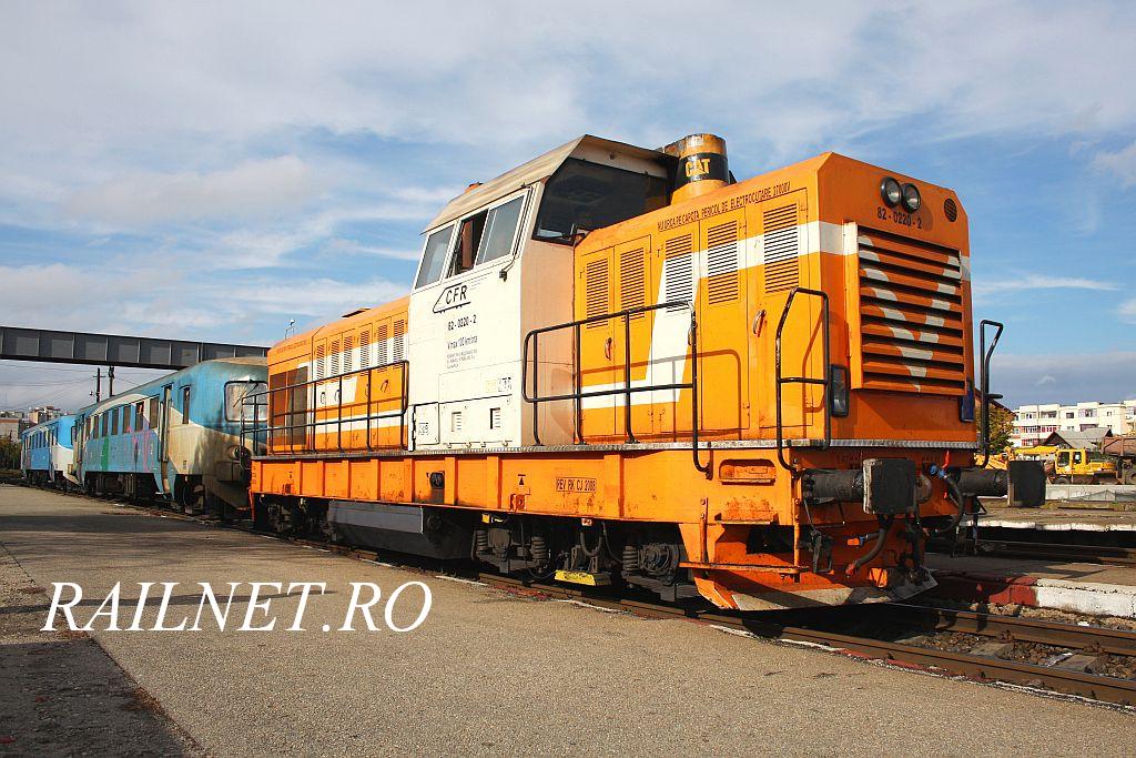 Cele doua automotoare trec remorcate de masina 82-0220-2 catre Depoul Pitesti la linia 1 a statiei.jpg