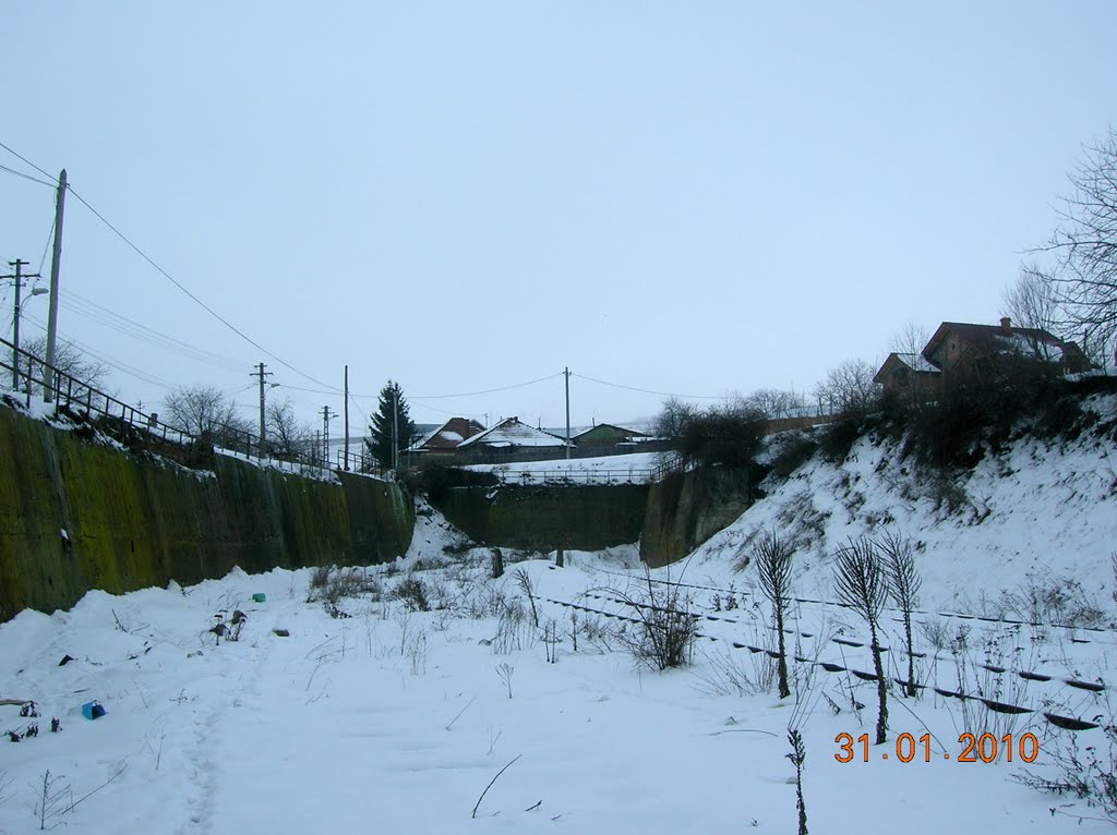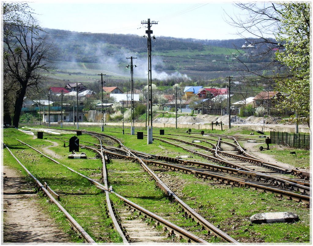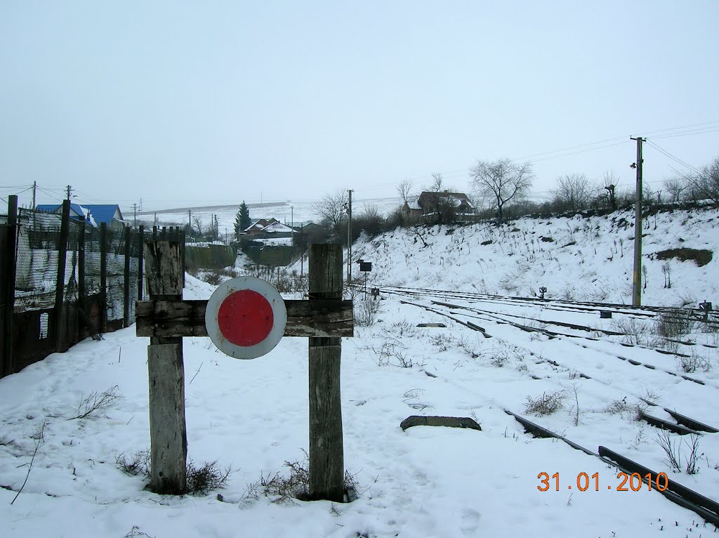 Husi- cap de linie! Cele doua linii care se termina in apropierea zidului de beton din capatul infundat al statiei Husi. In locul liber din partea stanga a imaginii era linia pentru depozitul Peco (acolo erau garate si descarcate vagoanele-cisterna cu produse petroliere, iar apoi aceste produse petroliere erau transportate la fostul depozit PECO situata pe strada Saca, printr-o conducta subterana)
