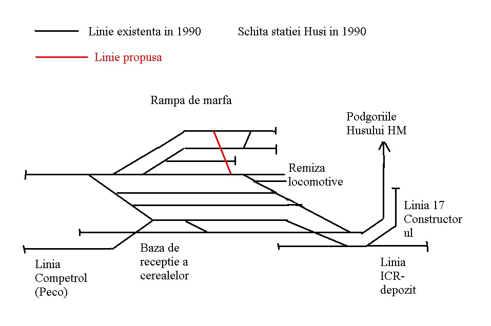 Schita liniilor din statia Husi- situatia din 1990 (cu negru- linii existente in 1990, cu rosi- linie propusa, pentru a permite accesul din liniile 8, 7 si 6 in linia curenta):