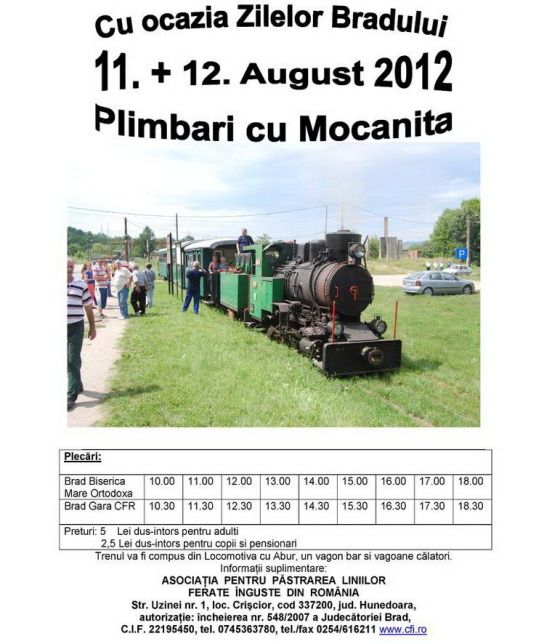 On the occasion of "Zilele Bradului" fest, in the small town of Brad, nearby the city of Deva (Romania), you are invited in a beautiful journey with the narrow gauge steam train, between 11 and 12 of august! The train will contain a bar coach, and a few standard passanger cars! The price for one journey is around 5 RON (about 1 euro) for adults, and 2.5 RON (about 50 euro cents) for children. :dance:
