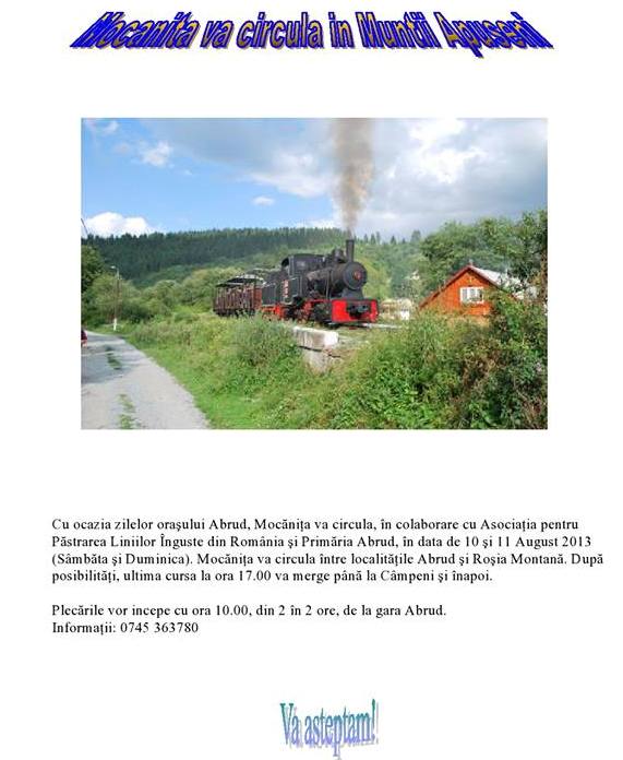 Sub egida sloganului "Mocanita va circula in Muntii Apuseni" primaria Abrud si Asociatia Pentru pastrarea Liniilor Inguste din Romania, va invita la o plimbare cu acest trenulet intre Abrud si Rosia Montana, in perioada 10 si 11 August 2013. Trenuletul cu aburi va iesi la drum cu ocazia zilelor orasului Abrud.